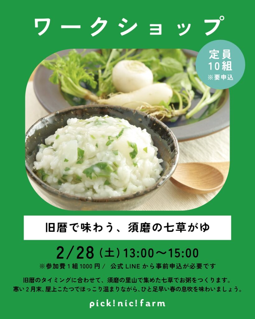 新暦の1月7日にはまだ眠っていた野草たちも、旧暦の1月7日(今年は2月23日)を過ぎる頃には、少しずつ顔を出し始めます。2月のWSでは、里山で集めた”本物”の春の七草を使って、温かい七草がゆをつくって食べましょう。スーパーのセットでは見られない、地面に生えているそのままの姿を観察したり、野草の豆知識を学んだり。こどもも大人も、「これがお粥に入るんだ!」というワクワクを一緒に楽しみませんか?今回も屋上にこたつを出してお待ちしています。🙆‍♀️