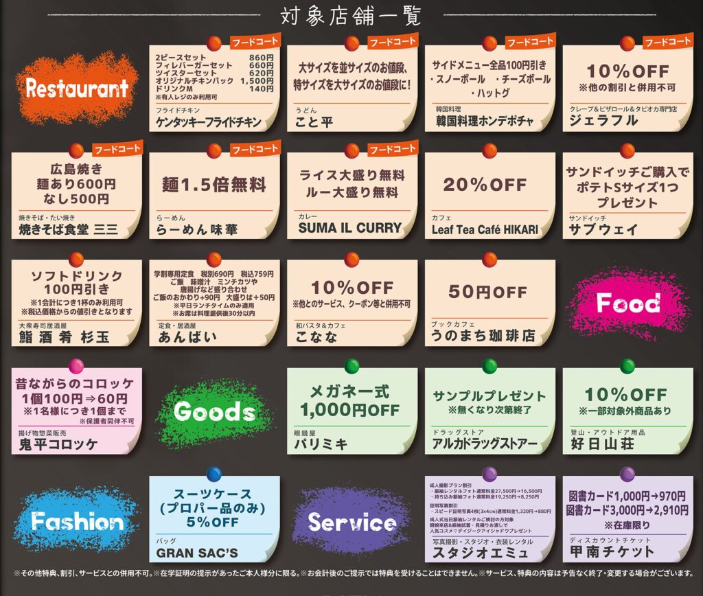 学生証・生徒手帳(中学生以上)を見せるだけでお得な特典が受けられます!